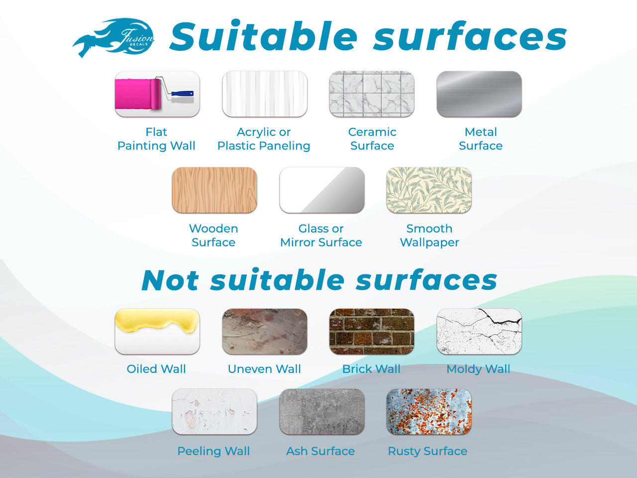 Our decals are easy to apply and remove, with no background material to worry about. They are perfect for short-term or long-term use on walls, windows, and other smooth surfaces. For best results, apply the decal to a clean, dry surface. We recommend removing the decal within 3 years to prevent any residue or damage to your wall paint.
