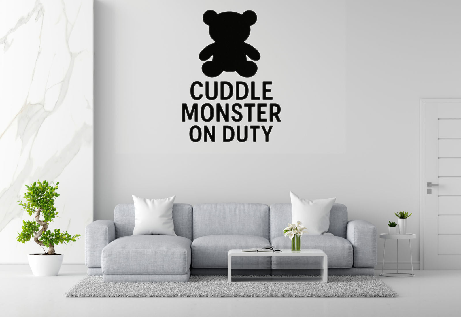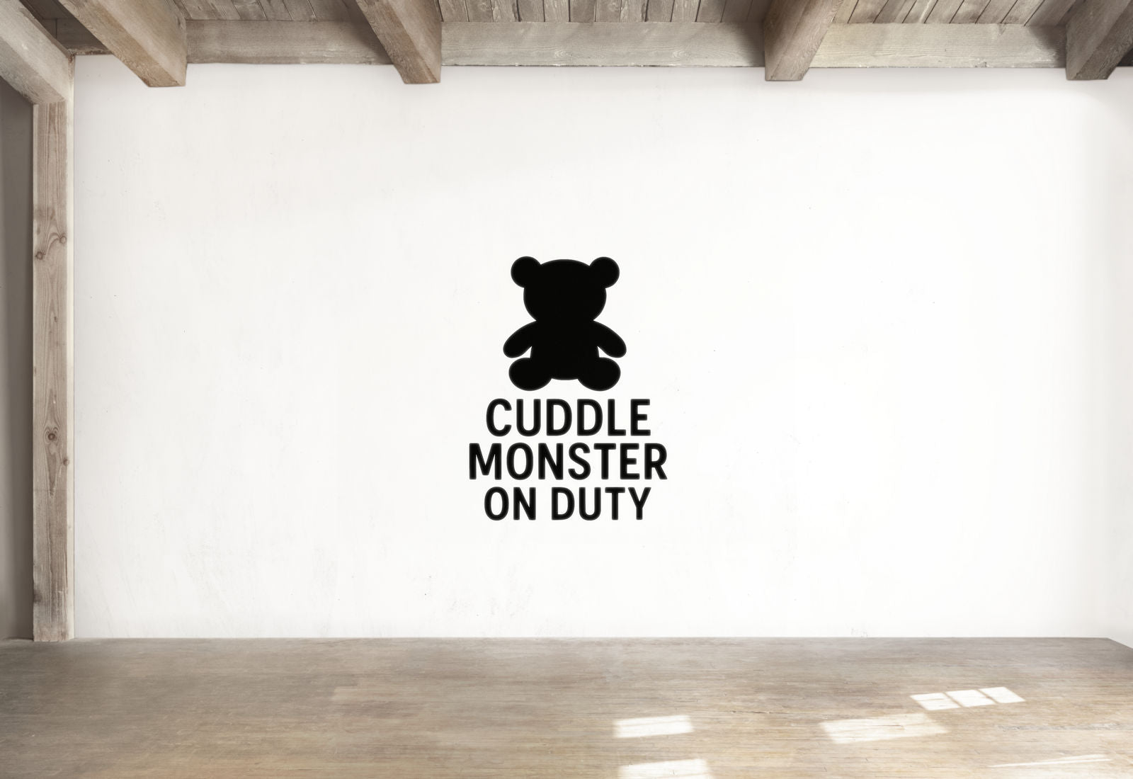 Announce your baby's most important job with this adorable 'CUDDLE MONSTER ON DUTY' wall decal featuring a teddy bear silhouette. Perfect for nurseries where snuggling is serious business!