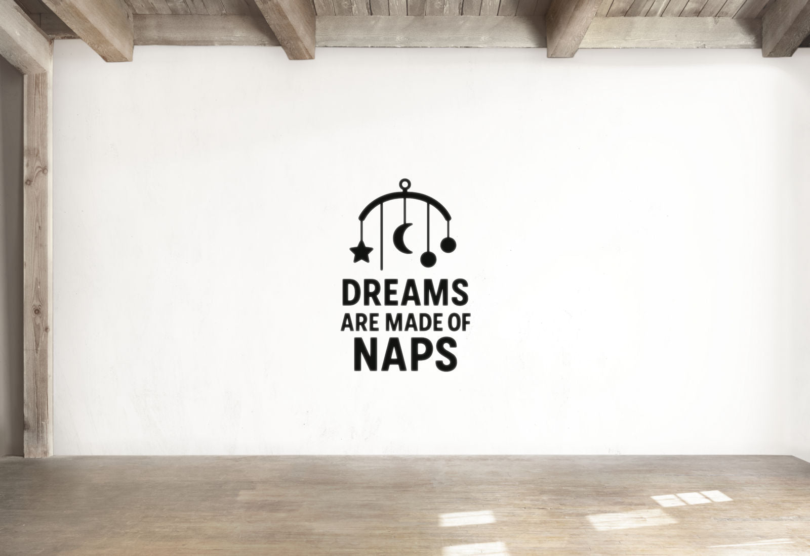 Celebrate the magic of baby sleep with this dreamy 'DREAMS ARE MADE OF NAPS' wall decal featuring a baby mobile silhouette. Perfect for nurseries where naptime is the most important time of day!