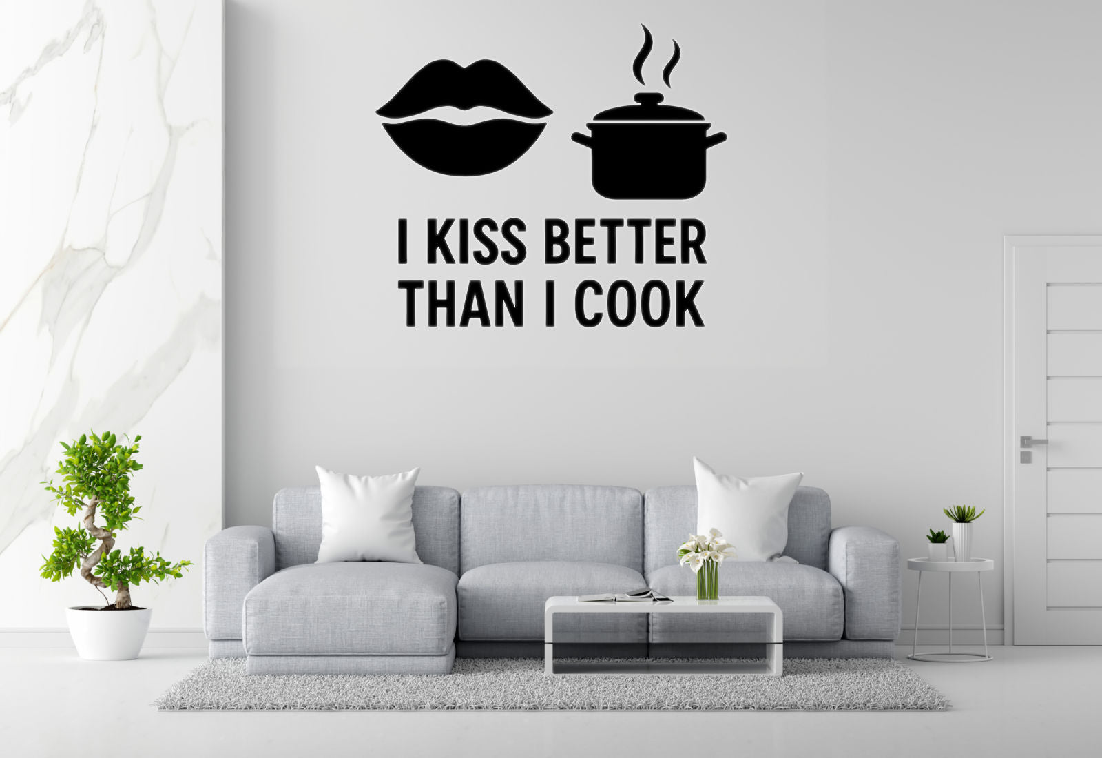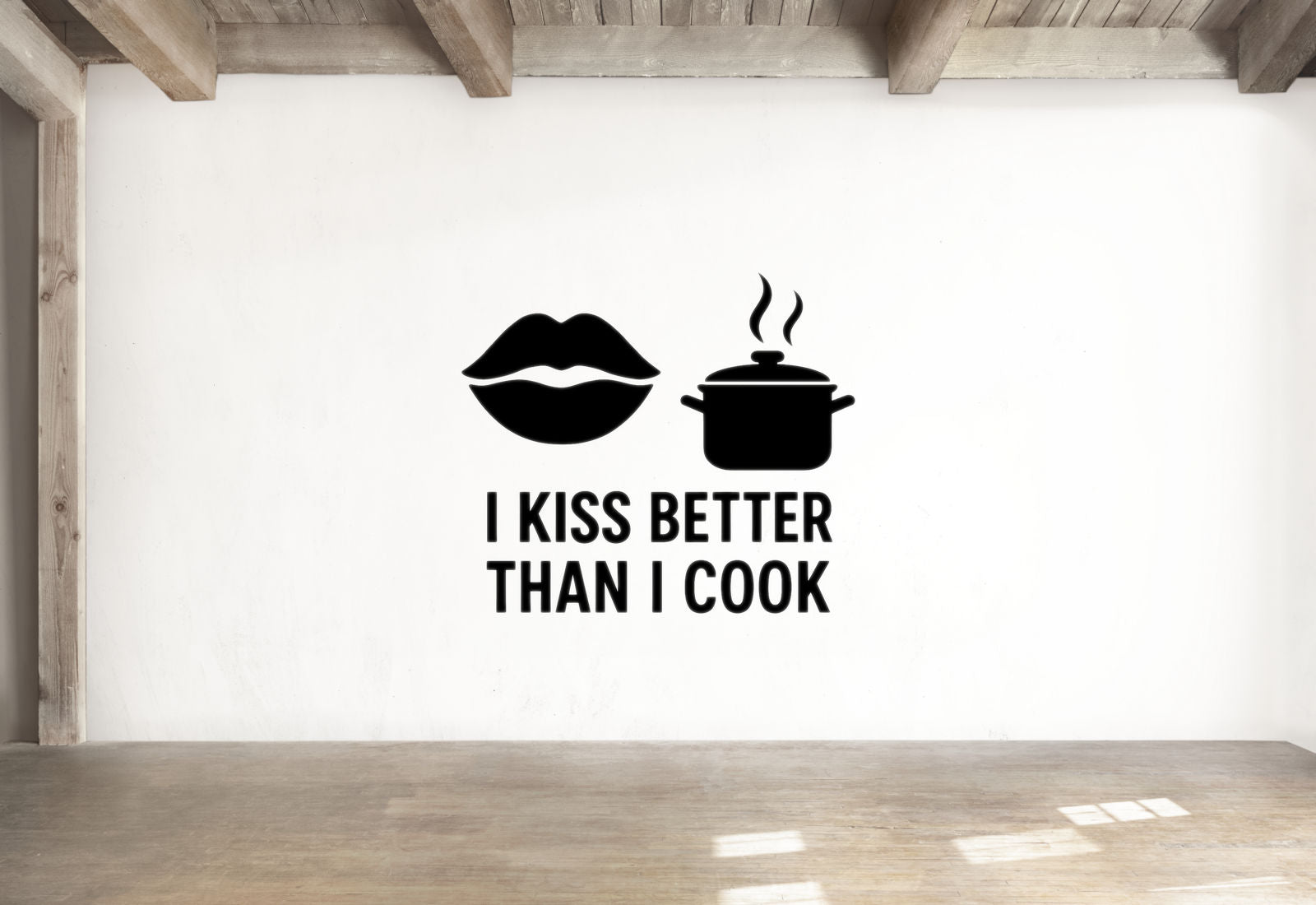 Sometimes it's better to be honest about your strengths! This charmingly self-aware kitchen wall decal features lips silhouette next to a cooking pot with steam and the flirtatious confession 'I Kiss Better Than I Cook' - because not everyone can be a master chef, but everyone has their own special talents.
