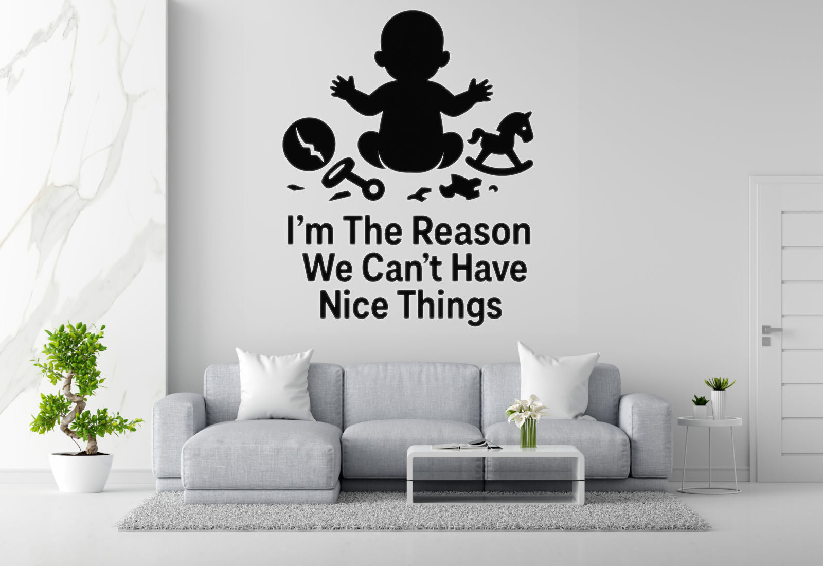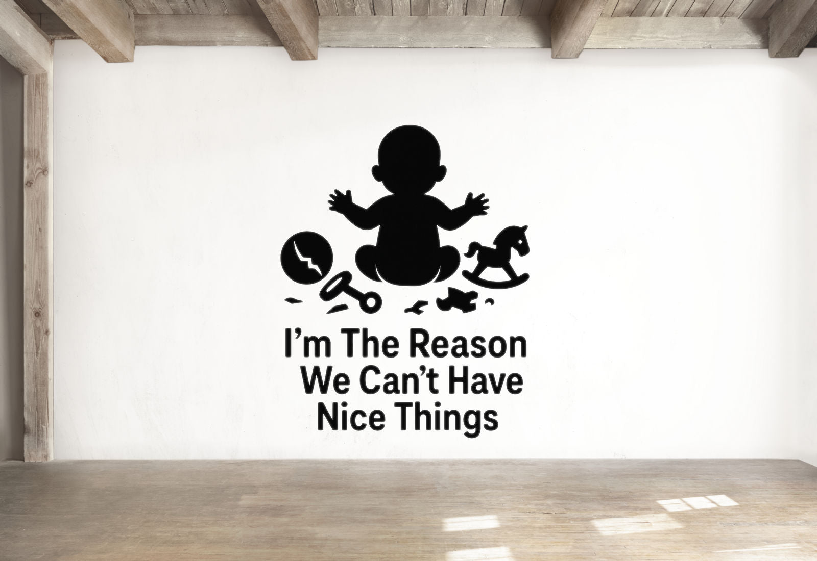 Every parent knows the truth - the moment a baby arrives, nice things become a distant memory! This hilariously honest baby room wall decal features a baby sitting innocently surrounded by broken toys, scattered items, and general chaos with the truthful confession 'I'm The Reason We Can't Have Nice Things' - celebrating the beautiful destruction that comes with little ones.