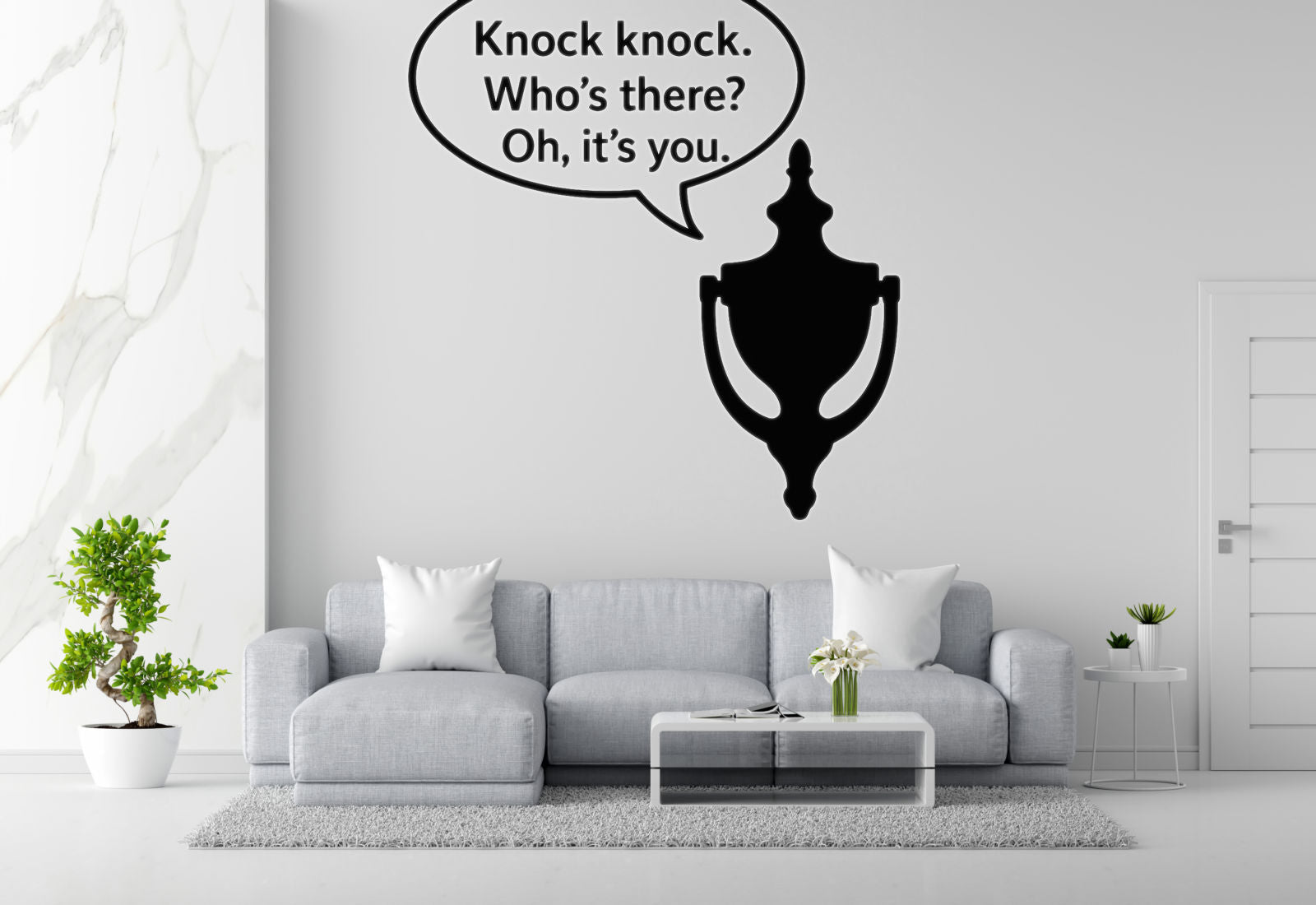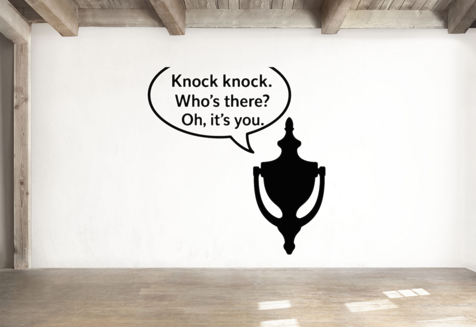 Transform the classic knock-knock joke into the perfect entryway greeting with this witty wall decal. Featuring an elegant door knocker with a speech bubble containing the hilariously underwhelming punchline 'Knock Knock. Who's There? Oh, It's You.' - it's the kind of greeting that's both welcoming and wonderfully sarcastic.