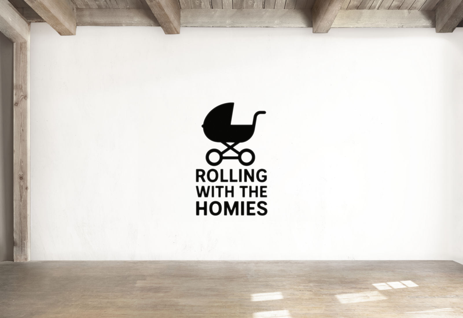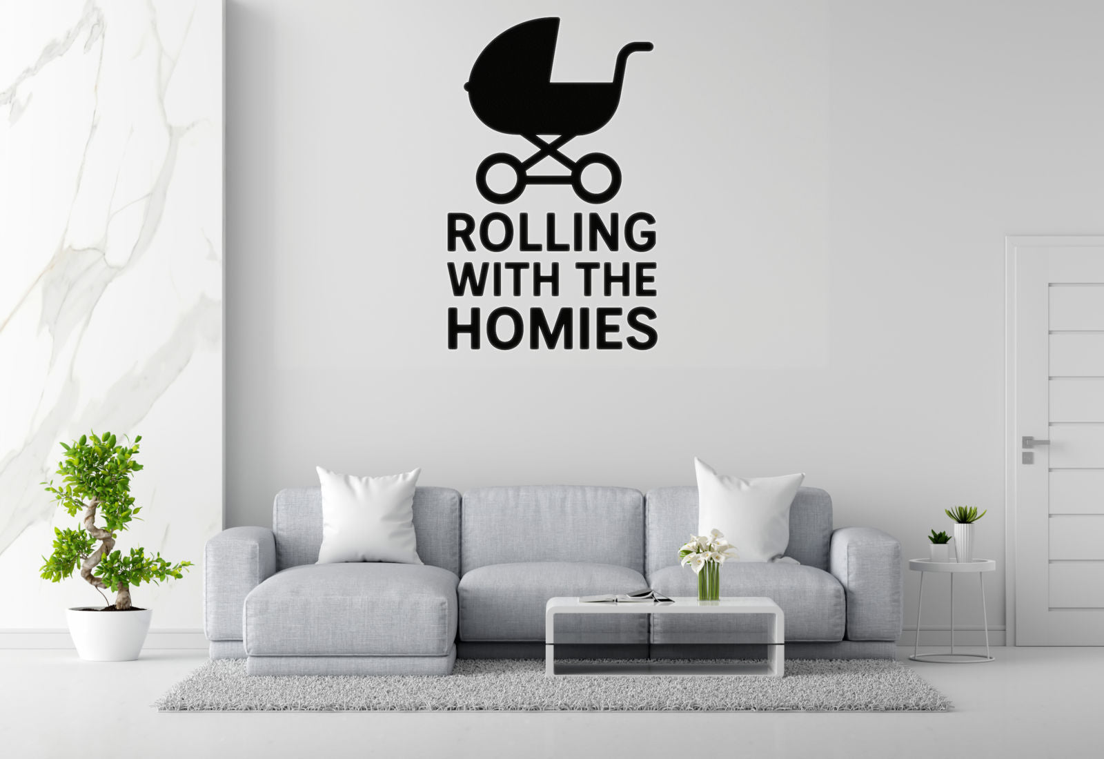 Show off your little one's social side with this cool 'ROLLING WITH THE HOMIES' wall decal featuring a baby stroller silhouette. Perfect for nurseries where baby is already the leader of their own crew!