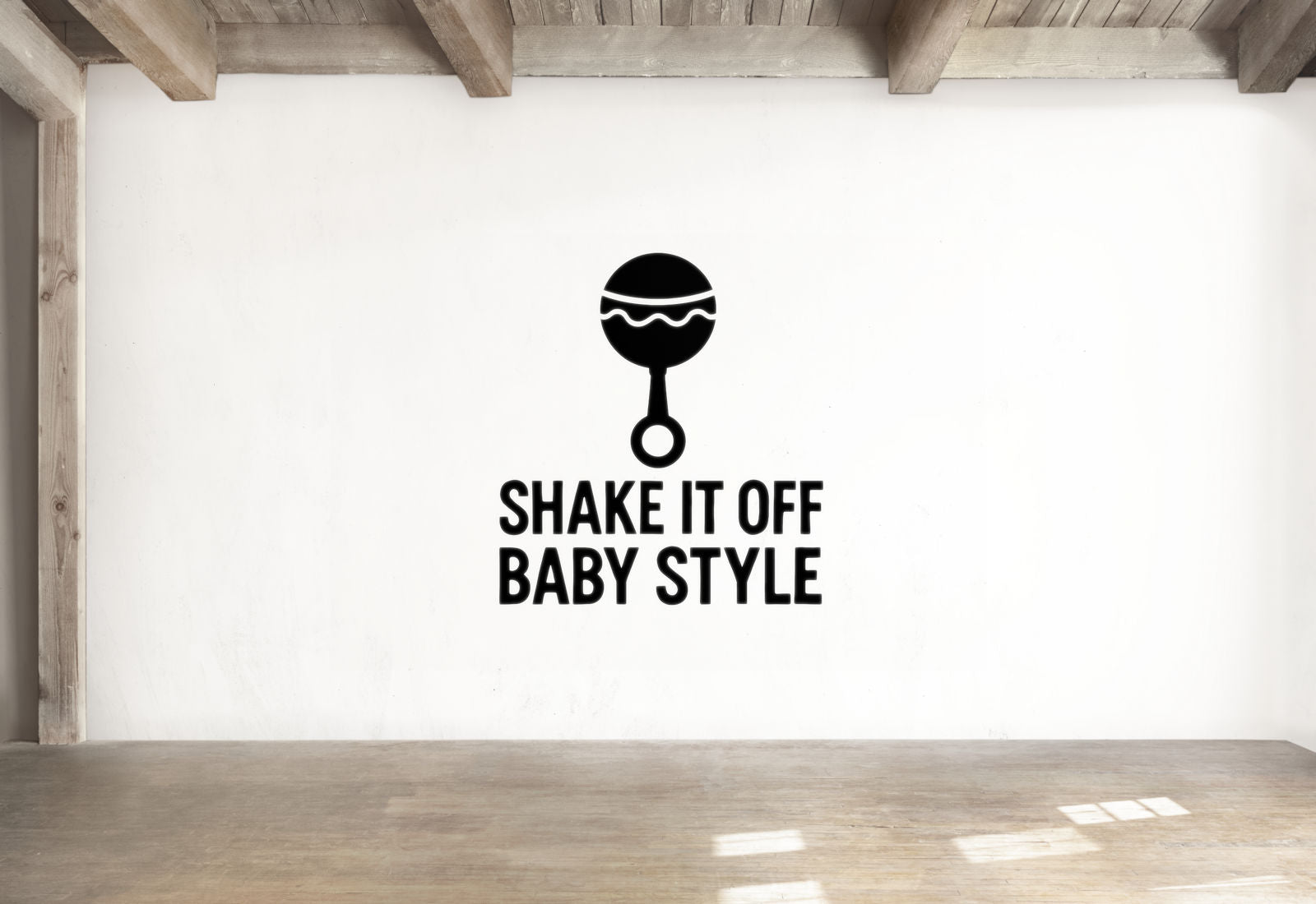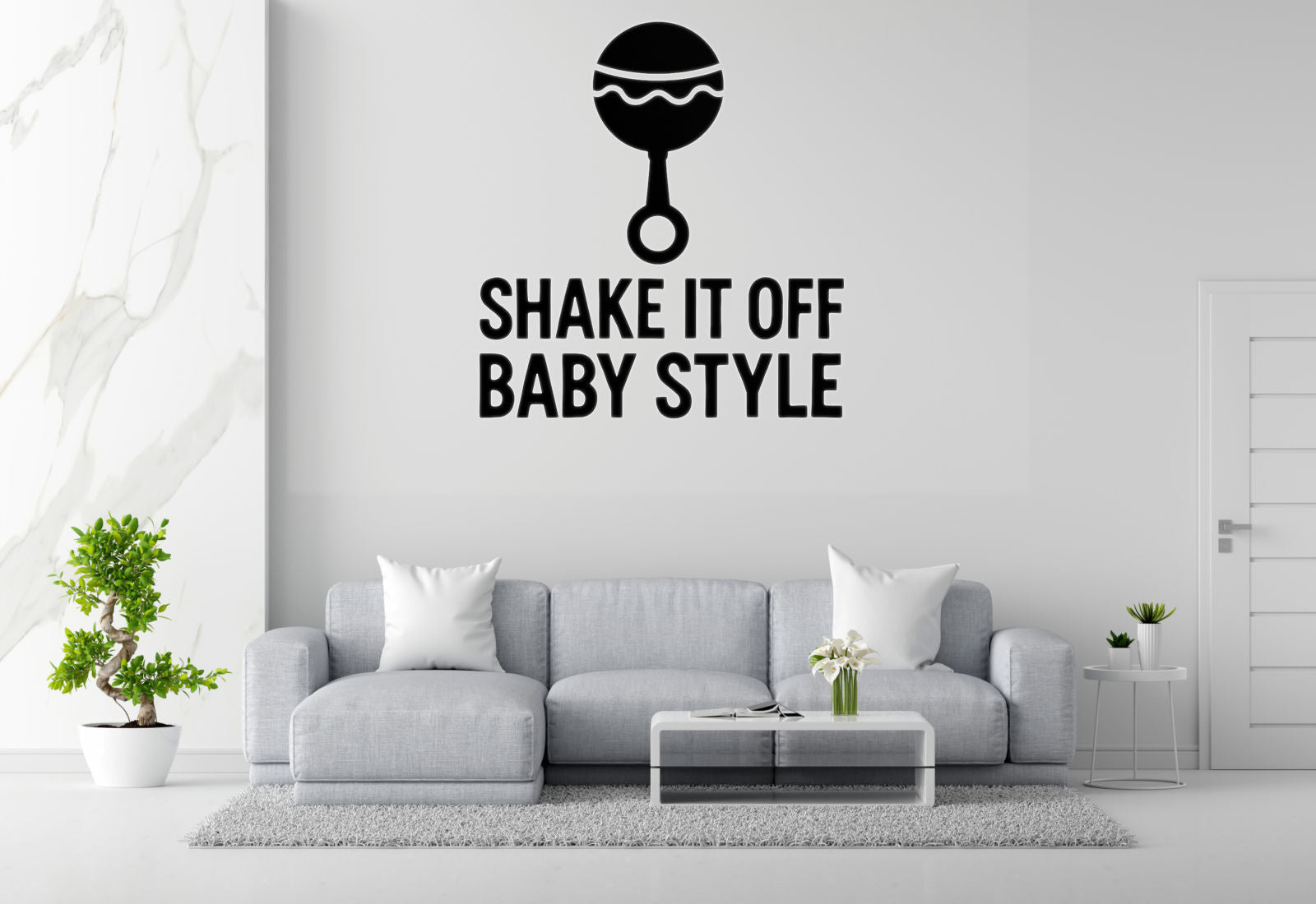 Celebrate your little one's natural rhythm with this playful 'SHAKE IT OFF BABY STYLE' wall decal featuring a baby rattle silhouette. Perfect for nurseries where every shake is a dance move and every sound is music!