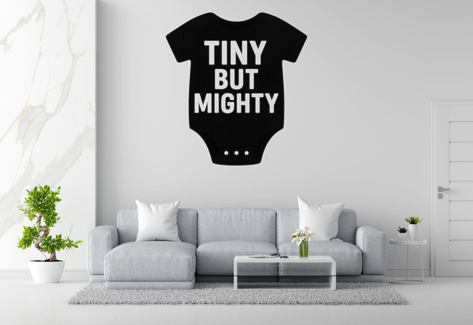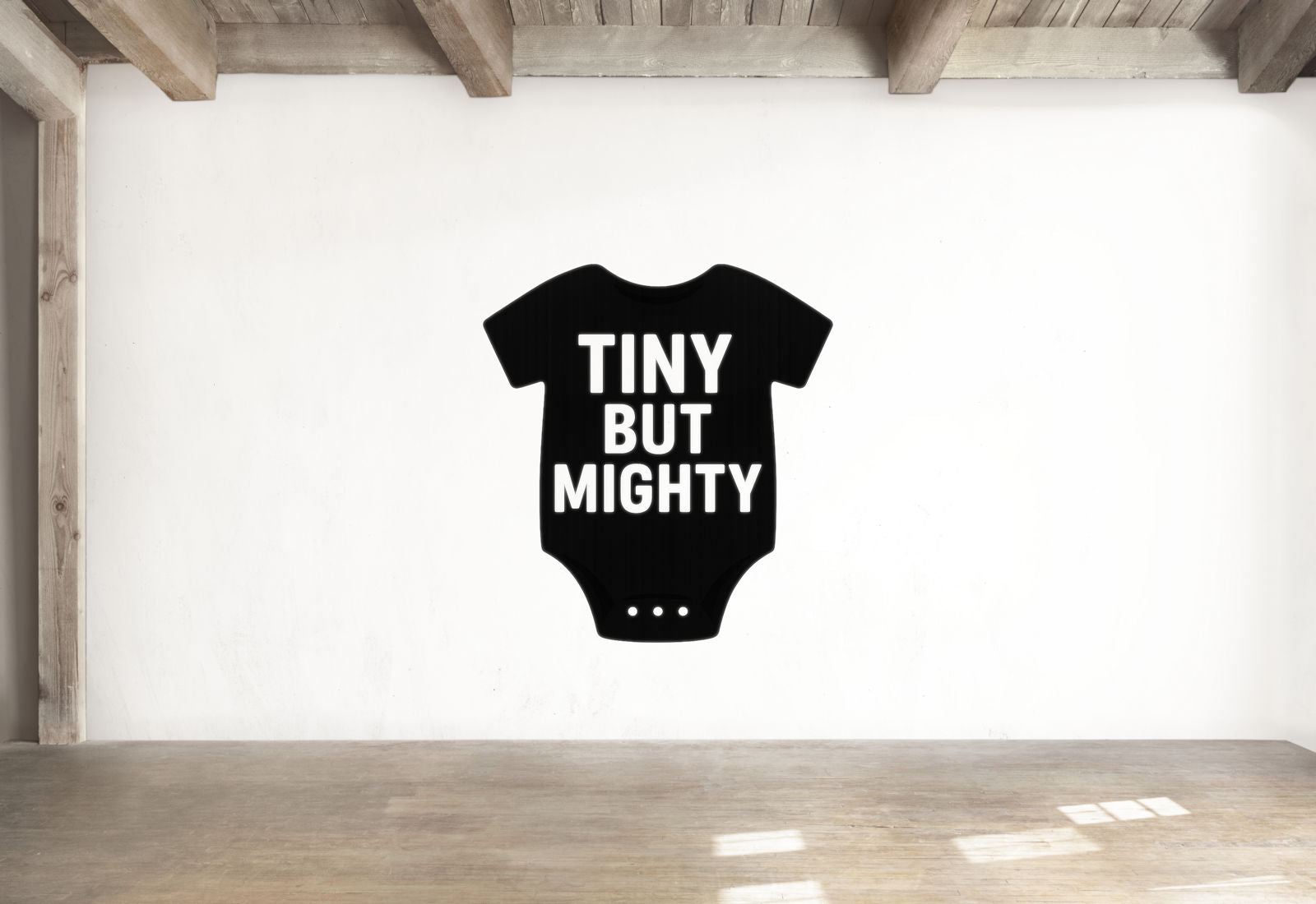 Celebrate your little one's incredible strength with this empowering 'TINY BUT MIGHTY' wall decal featuring a baby onesie silhouette. Perfect for nurseries that honor the amazing power packed into such a small person!